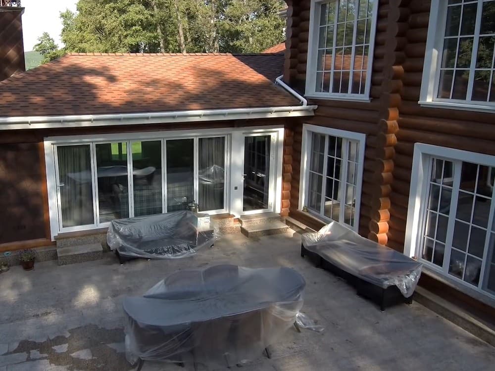 Выполненные работы: Установлена портально-сдвижная дверь, Профильная система REHAU Thermo, Ламинация изделий под дерево, Фурнитура Siegenia, Стеклопакет 40 мм с i-стеклом